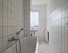 - Weiße Boden- und weiße Wandfliesen im Bad