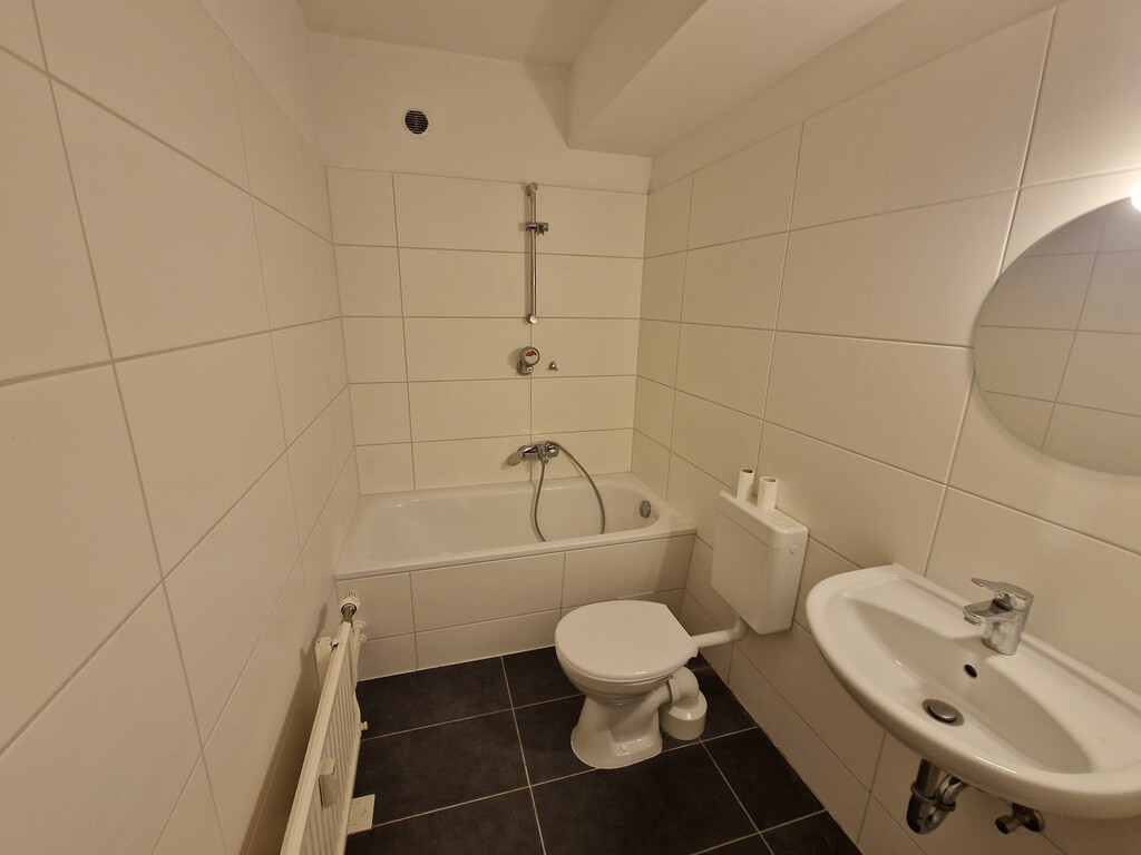 - Anthrazite Boden- und weiße Wandfliesen im Bad