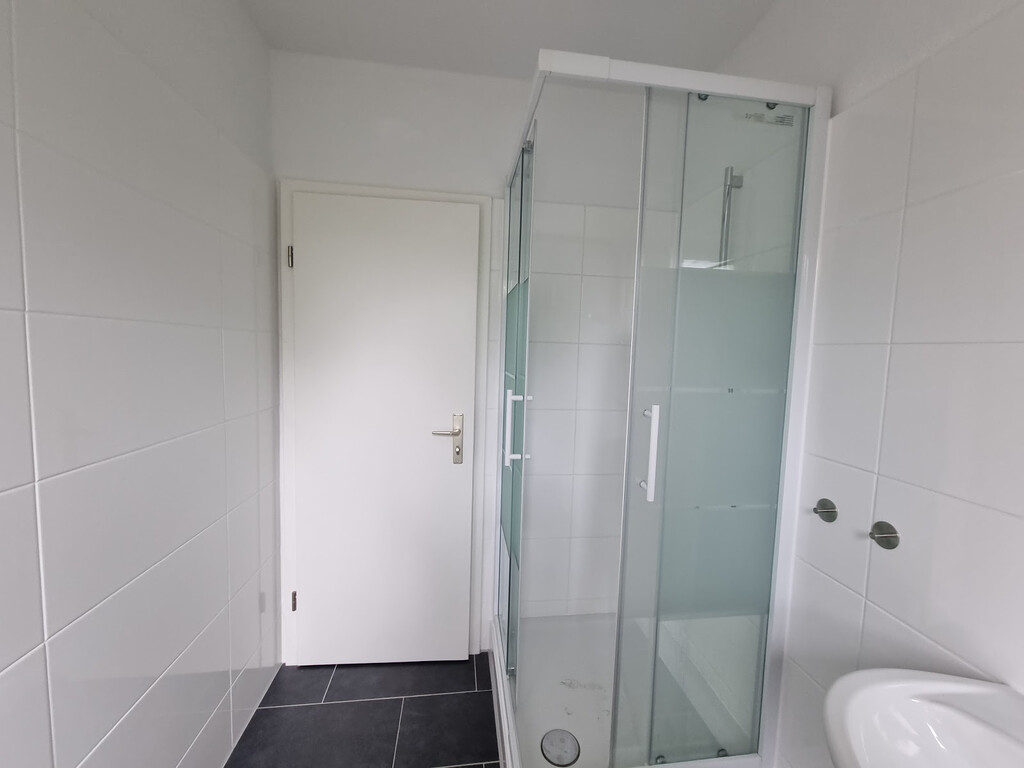 - Anthrazite Boden- und weiße Wandfliesen im Bad