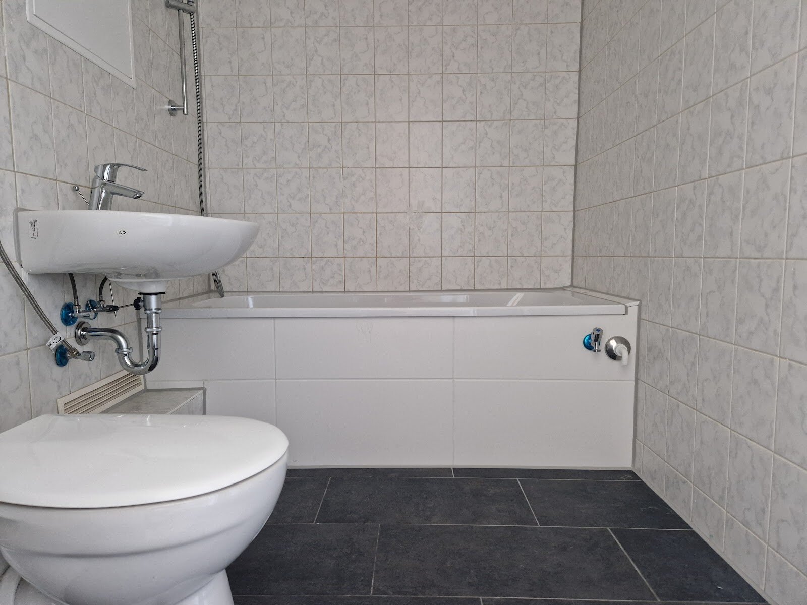 - Anthrazite Boden- und weiße Wandfliesen im Bad