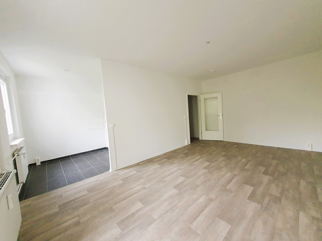 - Wohnbereich mit PVC-Boden und Raufasertapete – schlicht, pflegeleicht, bereit für Ihre Einrichtungsideen