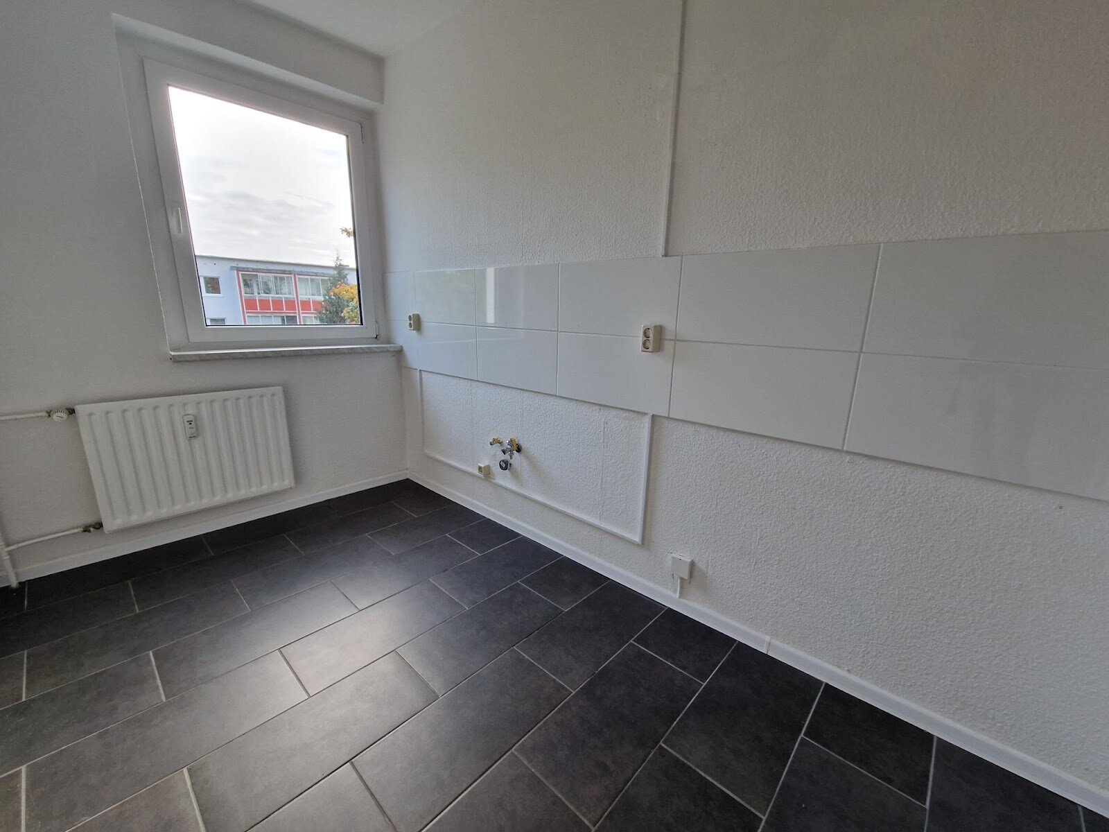 - Anthrazite Boden- und weiße Wandfliesen in der Küche