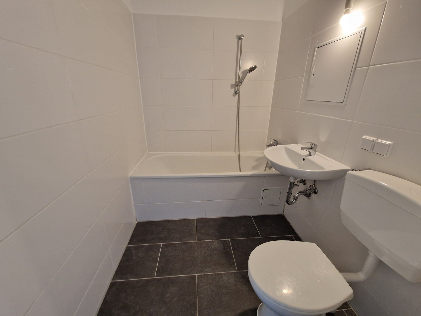 - Anthrazite Boden- und weiße Wandfliesen im Bad