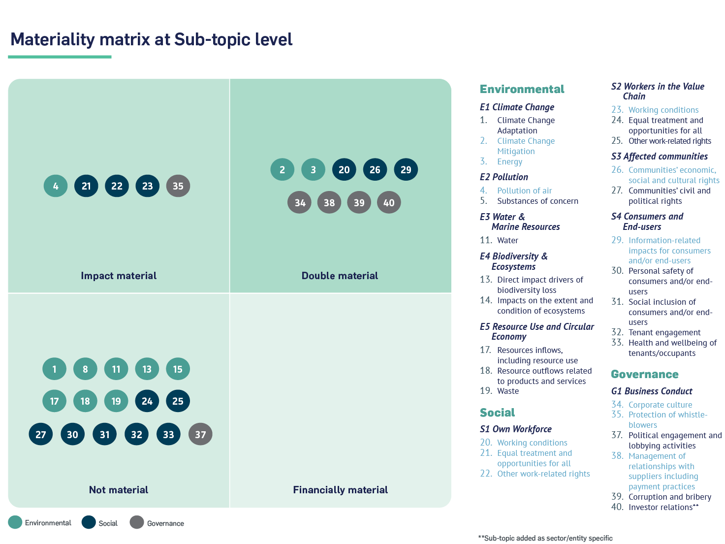 • Social: Own Workforce, Workers in the Value Chain, Consumers and End-users