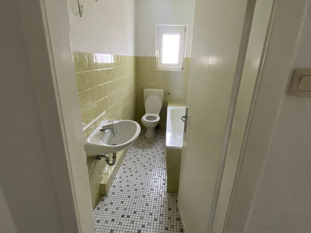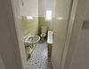 - Weiße Boden- und grüne Wandfliesen im Bad