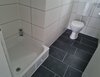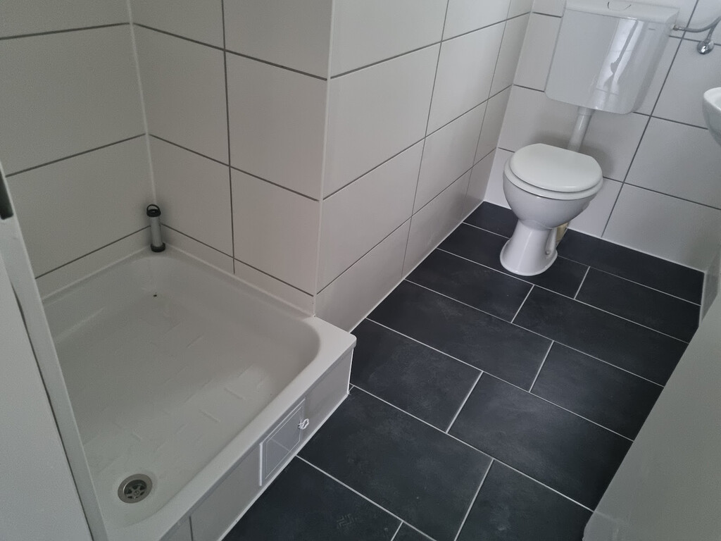 - Anthrazite Boden- und weiße Wandfliesen im Bad
