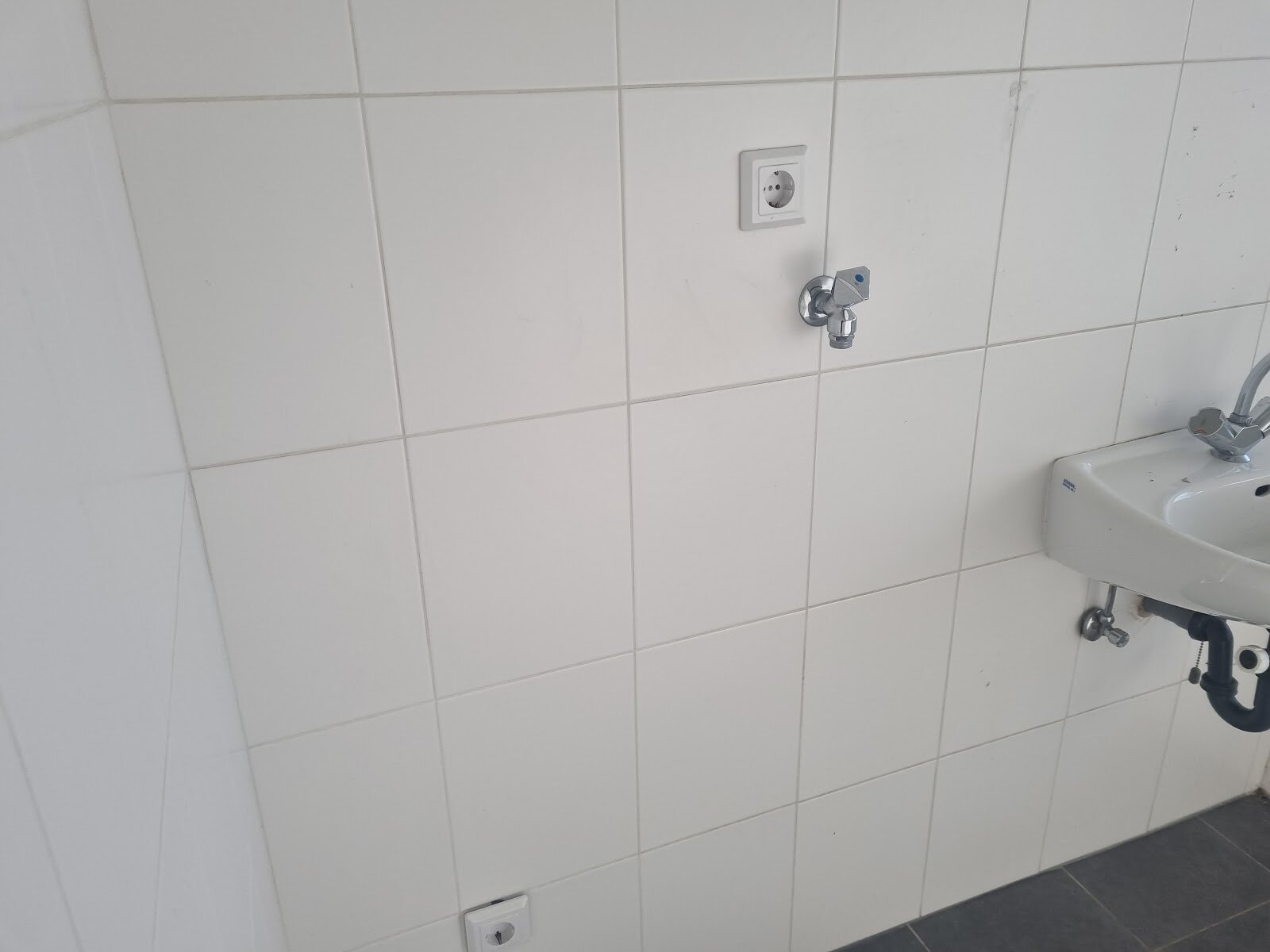 - Anthrazite Boden- und weiße Wandfliesen in der Küche