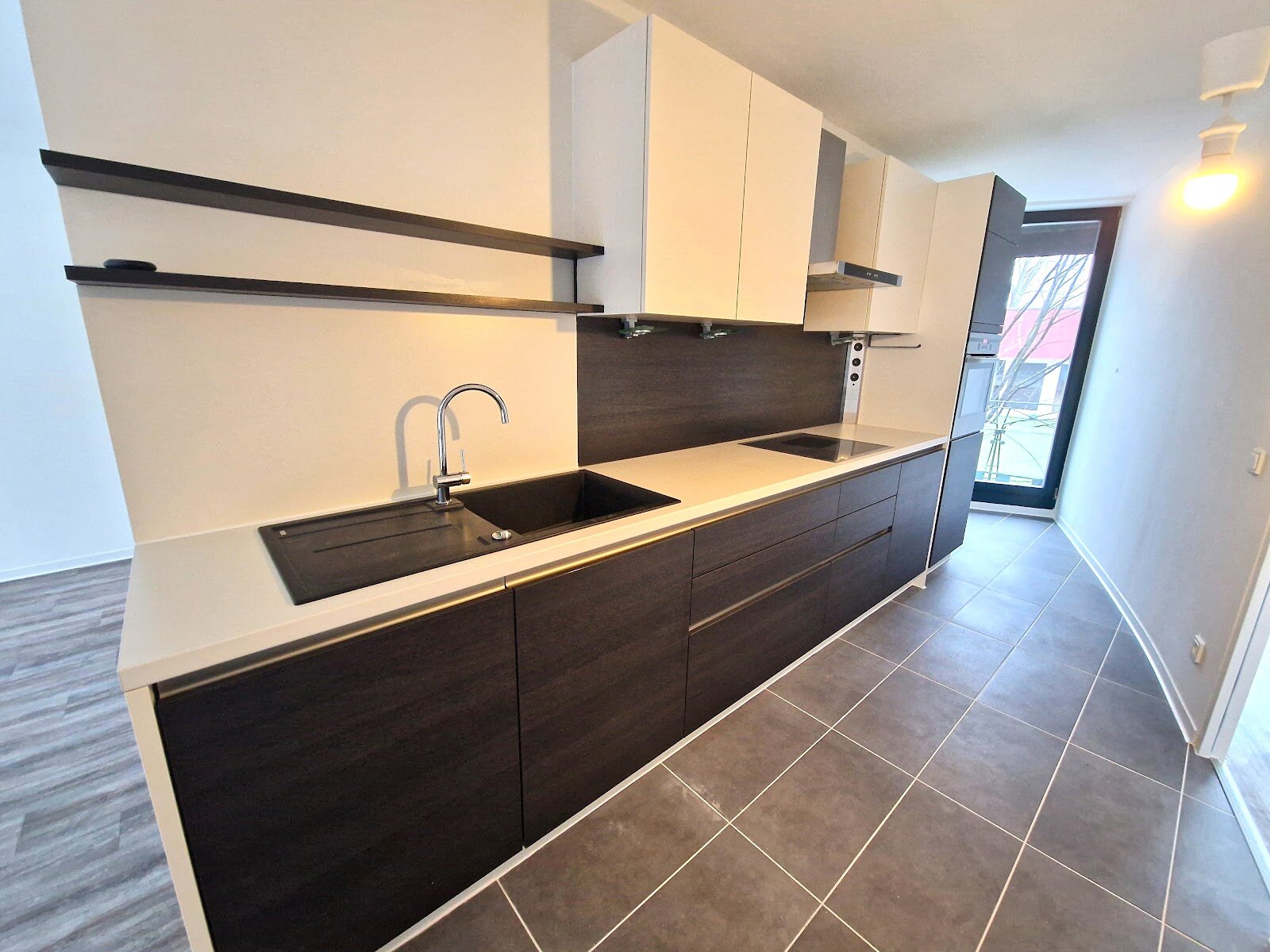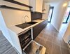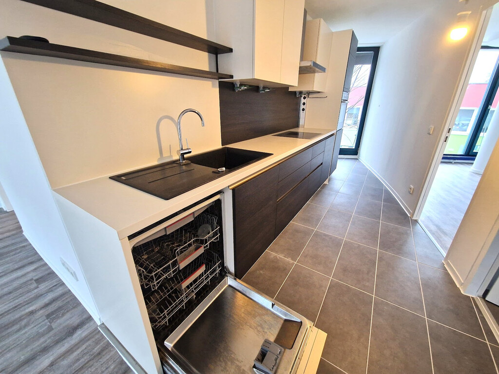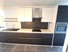 - Anthrazite Boden- und weiße Wandfliesen in der Küche