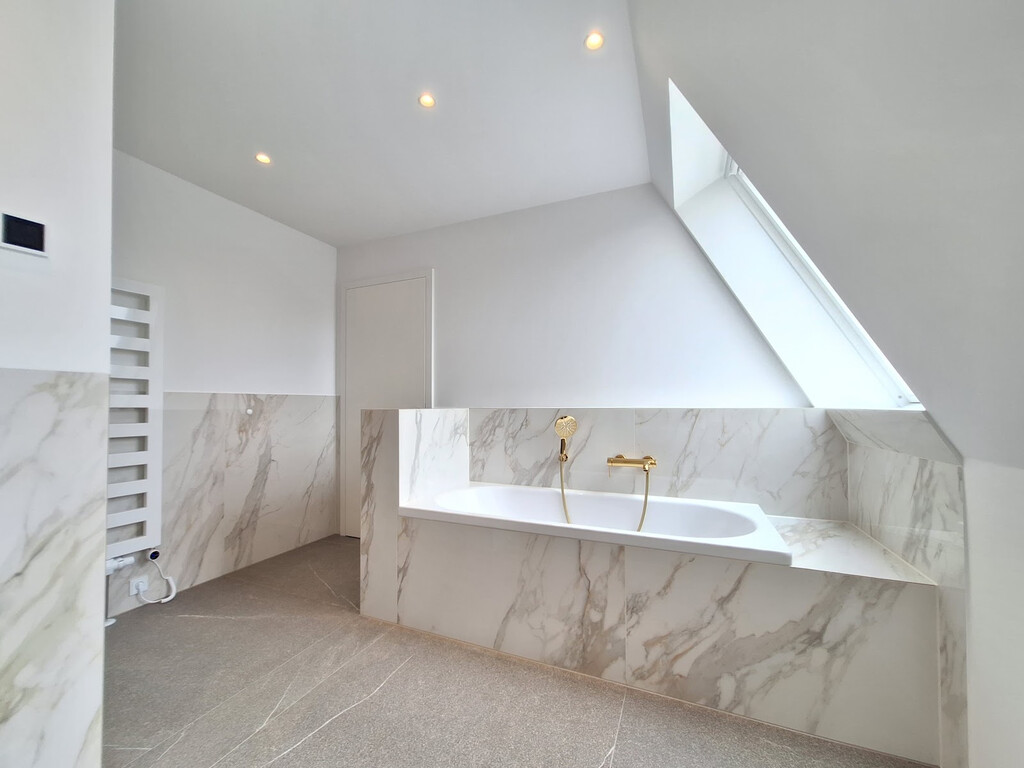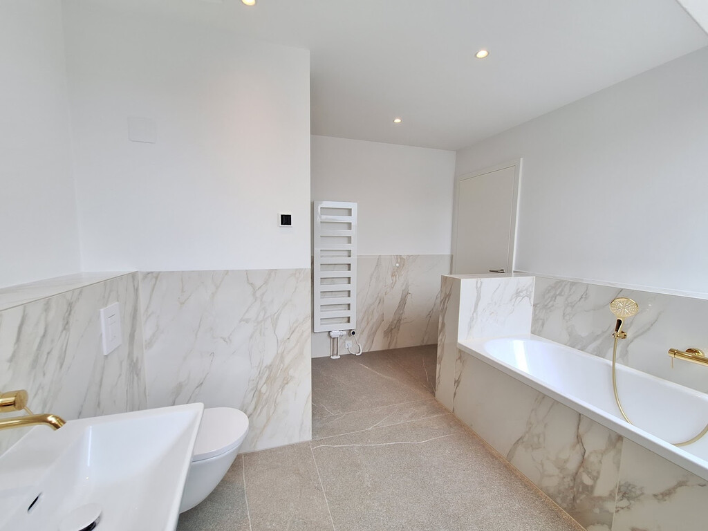 Großformatige, moderne Marmor-Fliesen in zeitloser Gestaltung unterstreichen den hochwertigen Charakter der Sanitärräume.
