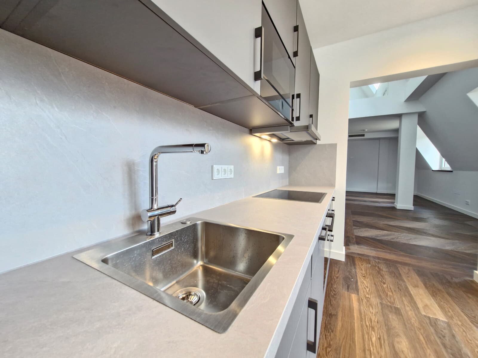 Die großzügige 1-Zimmer-Wohnung erstreckt sich über rund 80 m². Auf der unteren Ebene liegen der Wohn- und Schlafbereich sowie die Küche, während die darüberliegende Galerieebene perfekten Raum für Hobbys oder kreative Gestaltungsideen bietet.