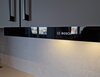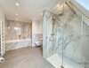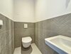 Großformatige, moderne Marmor-Fliesen oder Feinsteinzeug mit erhabener Linienstruktur in zeitloser Gestaltung unterstreichen den hochwertigen Charakter der Sanitärräume.
