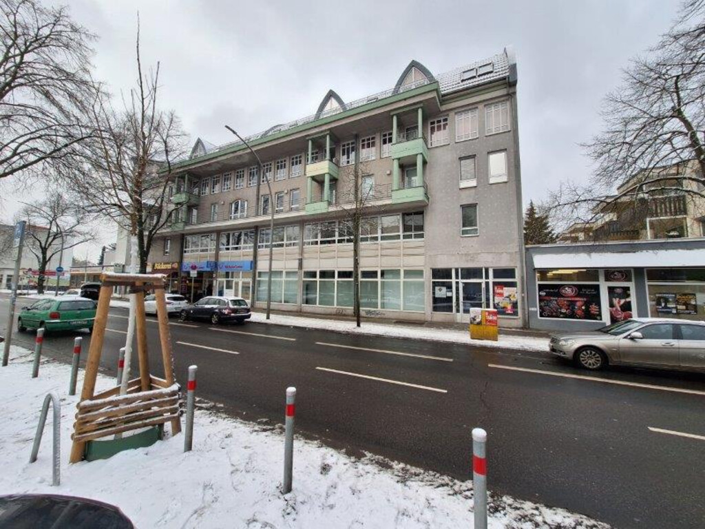 Die breite Fensterfront zur Hauptstraße gewährleistet eine hervorragende Sichtbarkeit und Werbewirksamkeit. Der Anschluss an den öffentlichen Personennahverkehr ist durch mehrere Bushaltestellen in fußläufiger Entfernung sichergestellt.