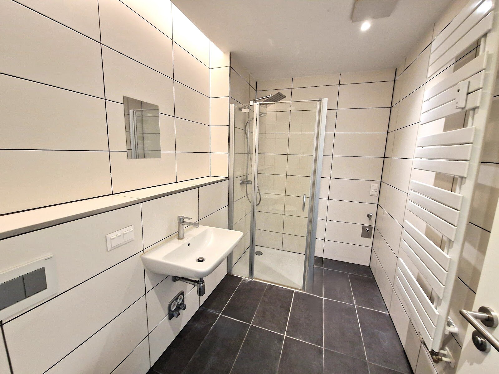 - Anthrazite Boden- und weiße Wandfliesen im Bad