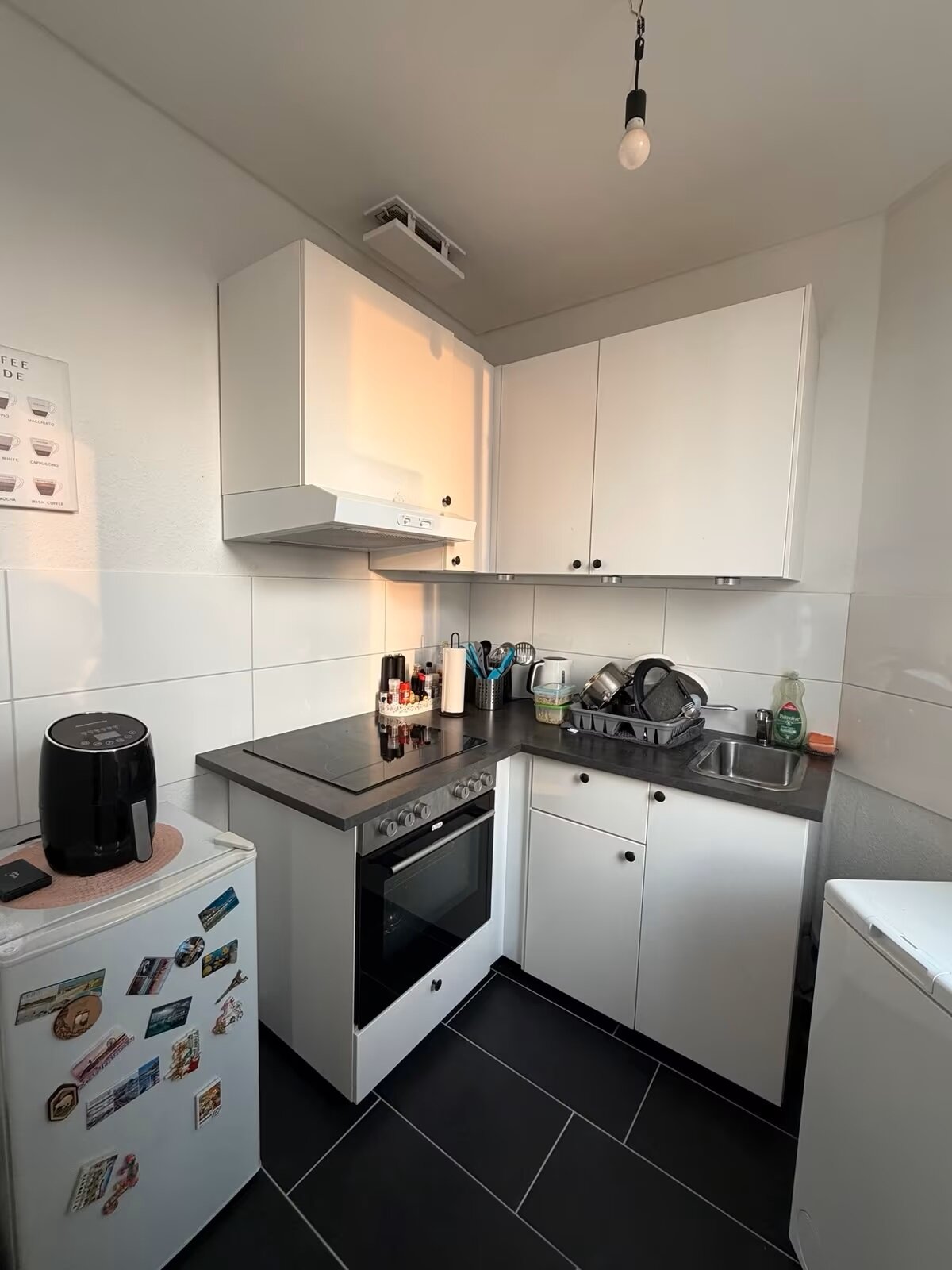 - Anthrazite Boden- und weiße Wandfliesen in der Küche