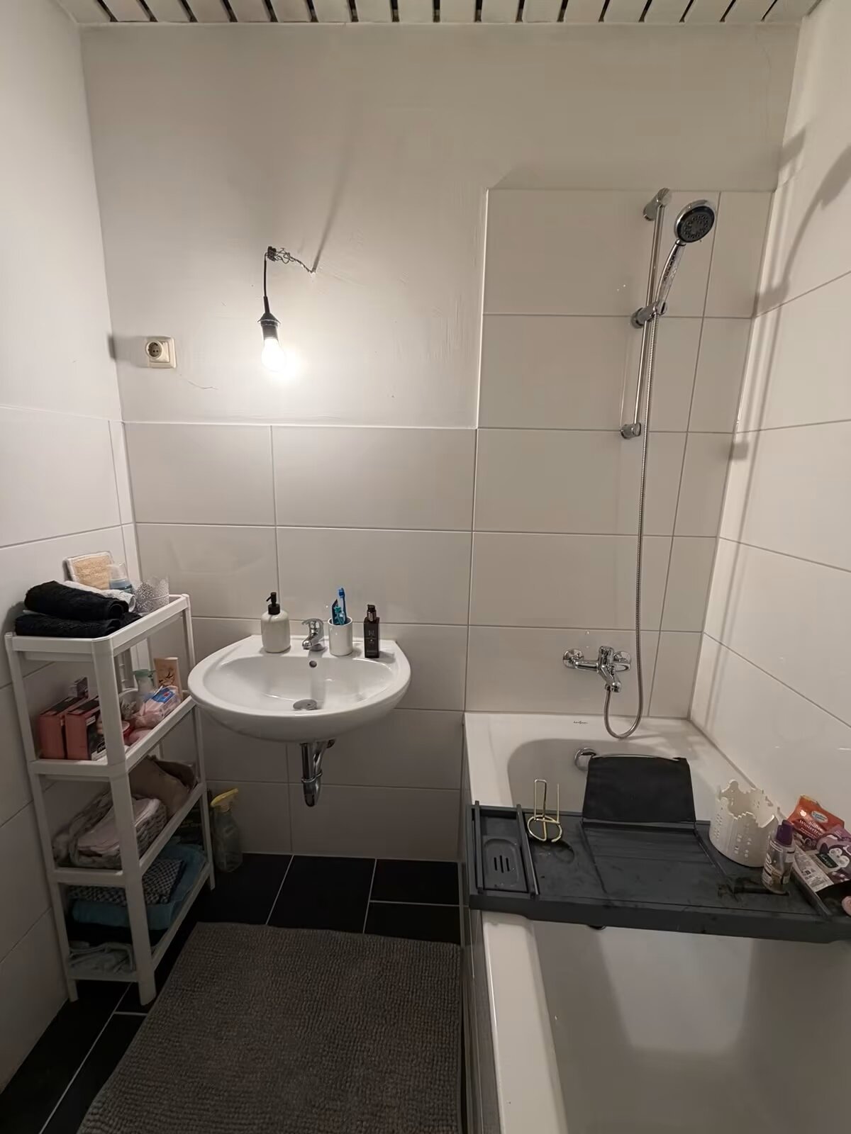 - Anthrazite Boden- und weiße Wandfliesen im Bad