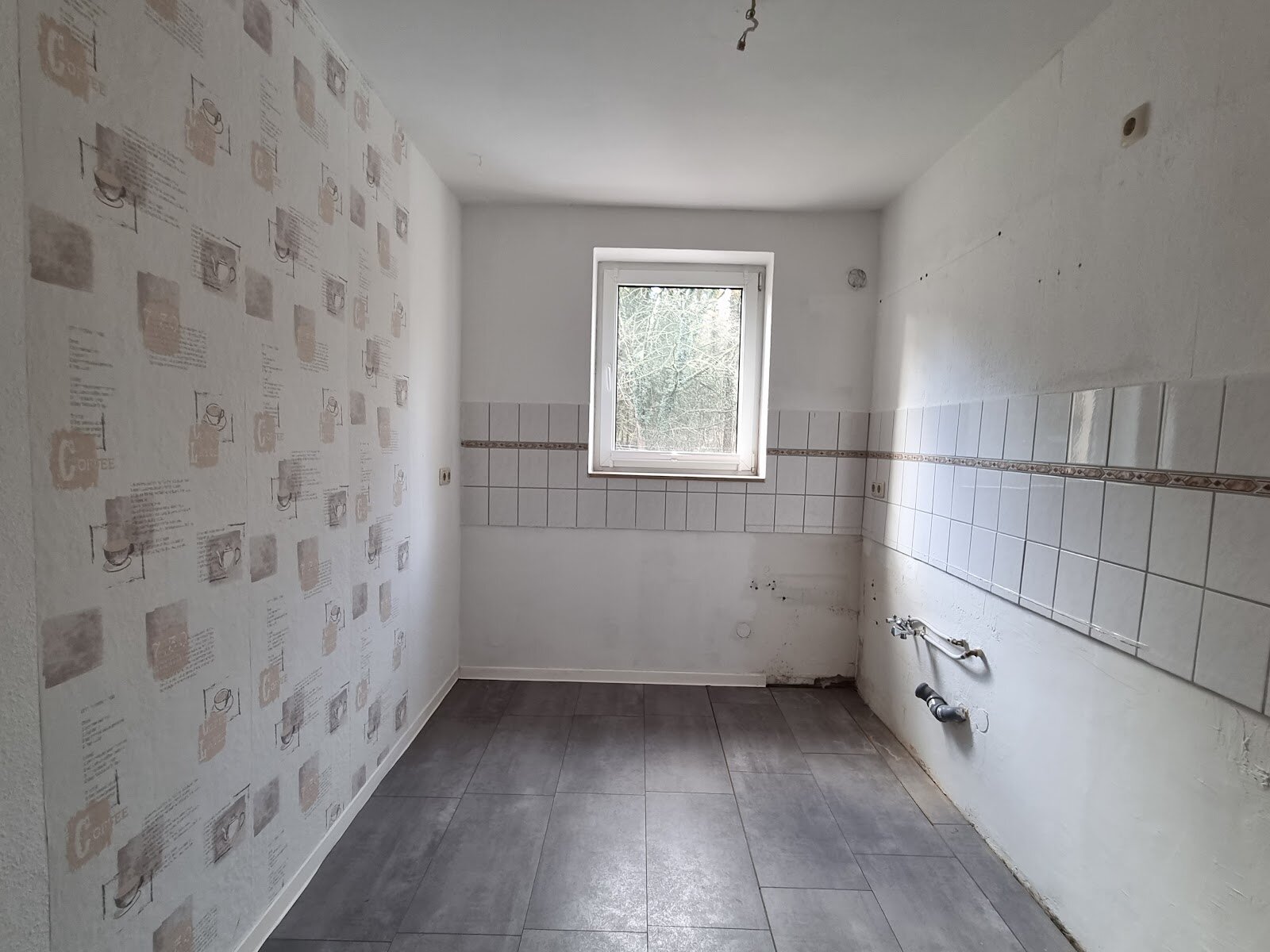 - Anthrazite Boden- und weiße Wandfliesen in der Küche
