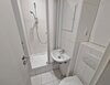 - Weiße Boden- und weiße Wandfliesen im Bad