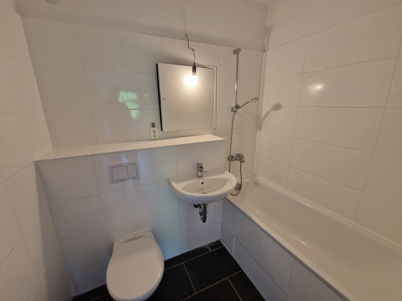 - Anthrazite Boden- und weiße Wandfliesen im Bad