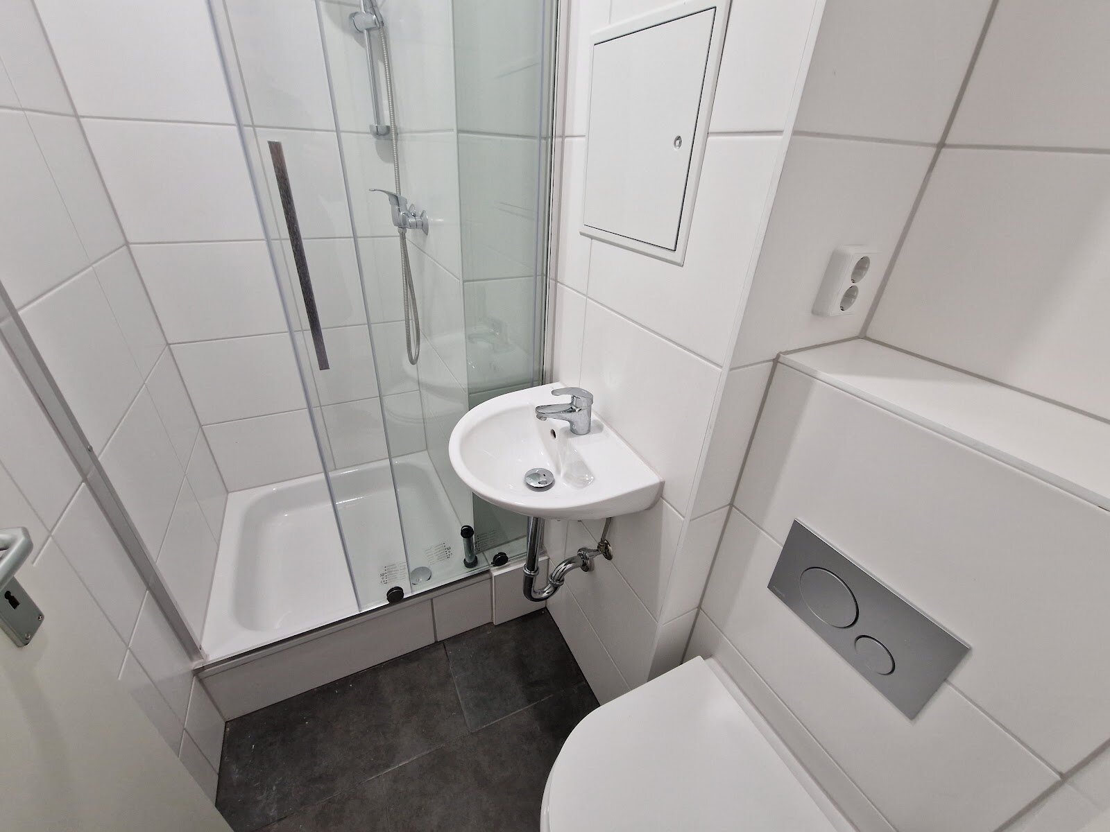- Anthrazite Boden- und weiße Wandfliesen im Bad
