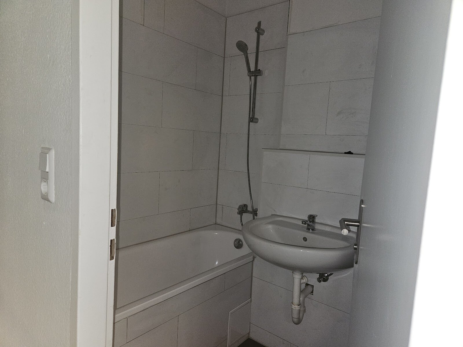 - Anthrazite Boden- und weiße Wandfliesen im Bad