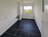 - Anthrazite Boden- und weiße Wandfliesen in der Küche