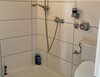 - Anthrazitfarbene Boden- und weiße Wandfliesen im Bad