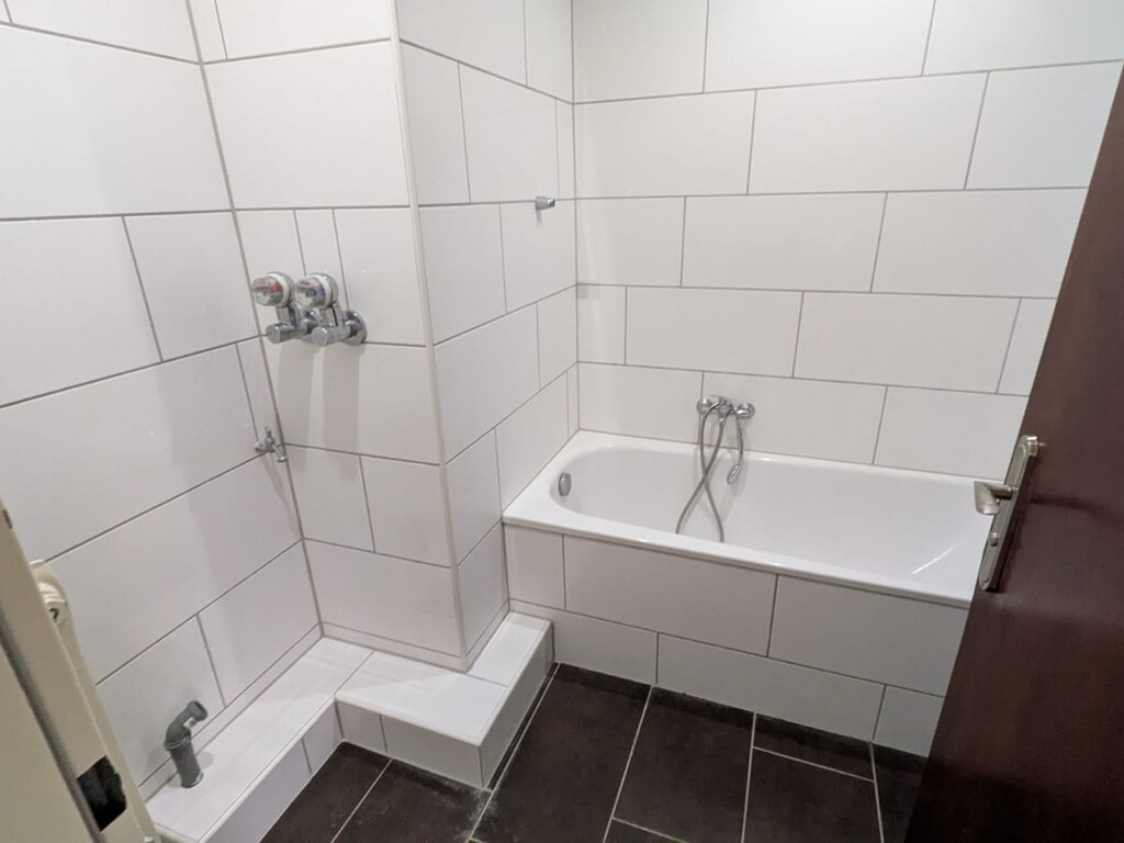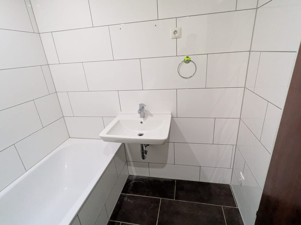 - Anthrazite Boden- und weiße Wandfliesen im Bad