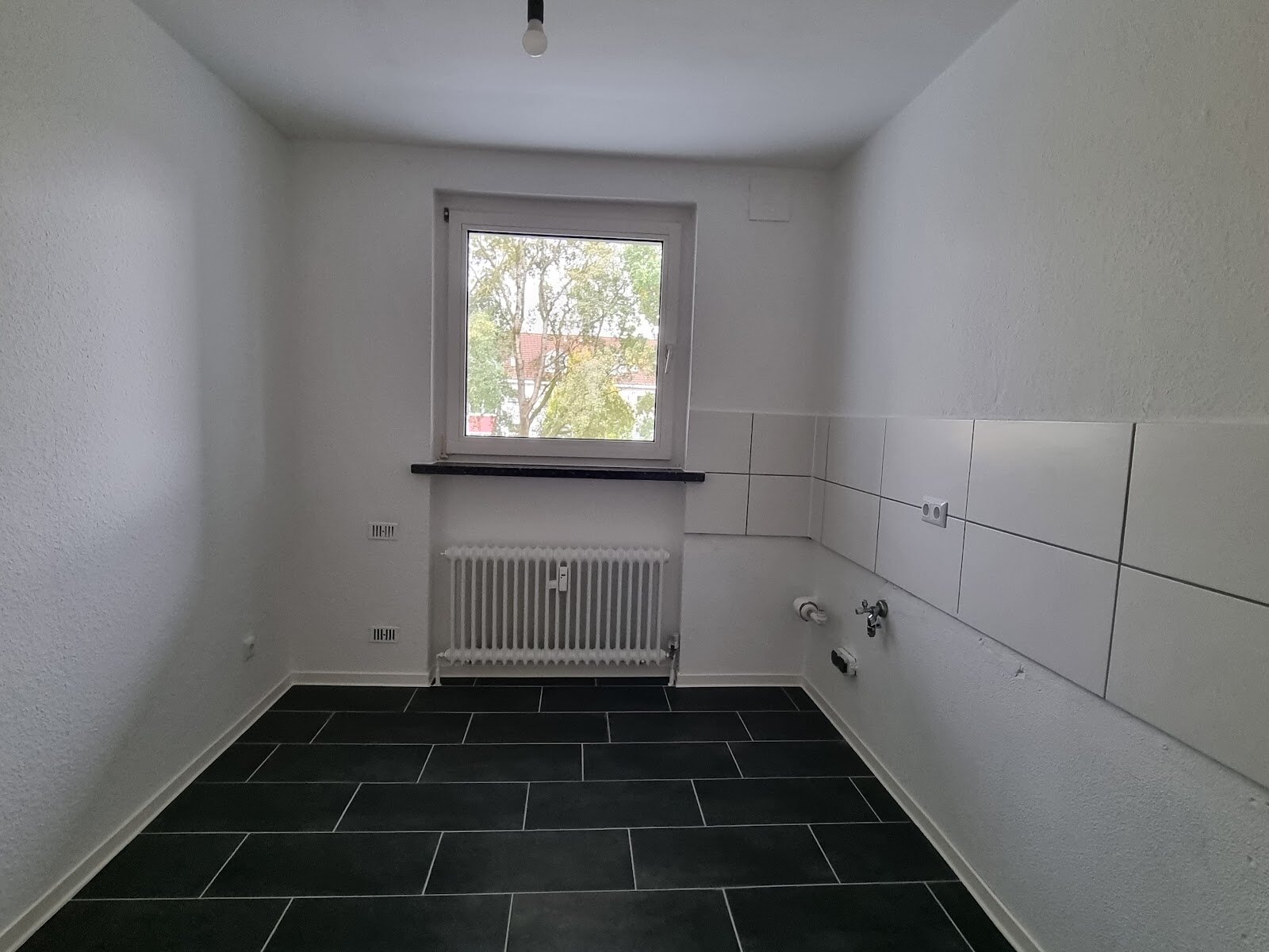 - Anthrazite Boden- und weiße Wandfliesen in der Küche