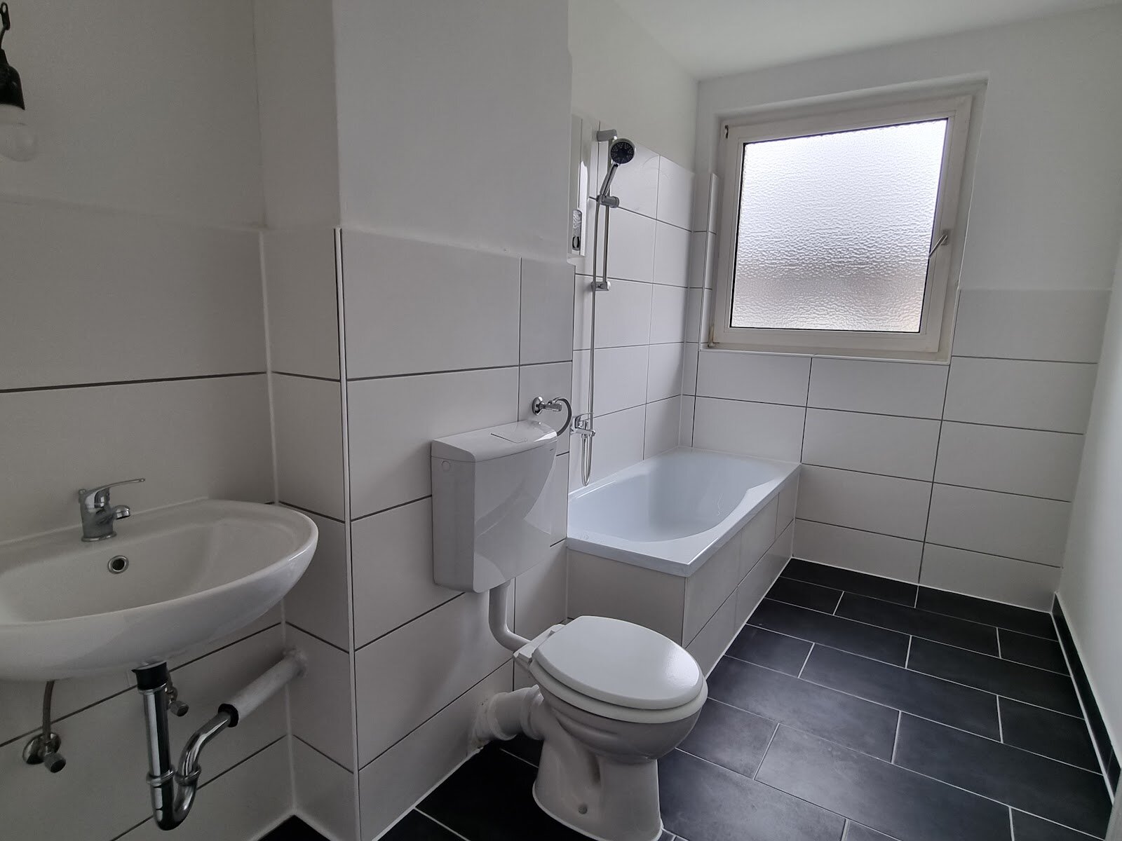 - Anthrazite Boden- und weiße Wandfliesen im Bad