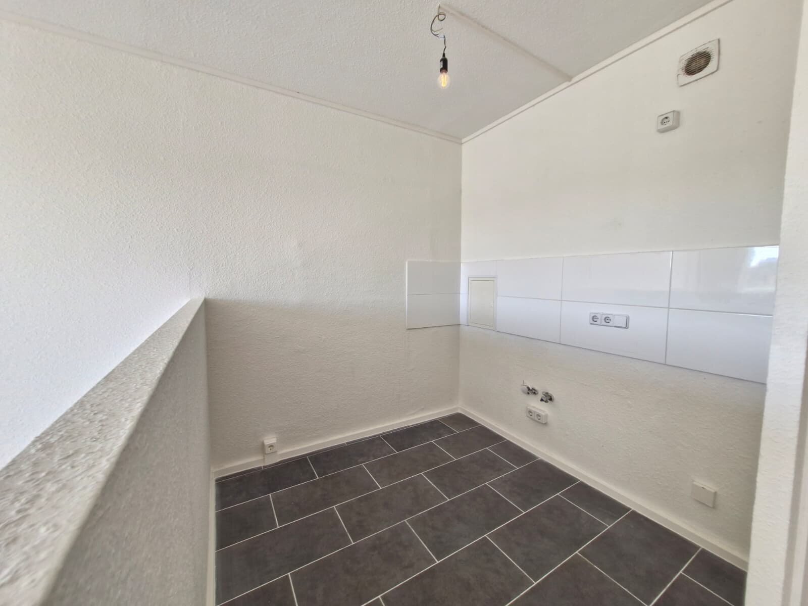- Anthrazite Boden- und weiße Wandfliesen in der Küche