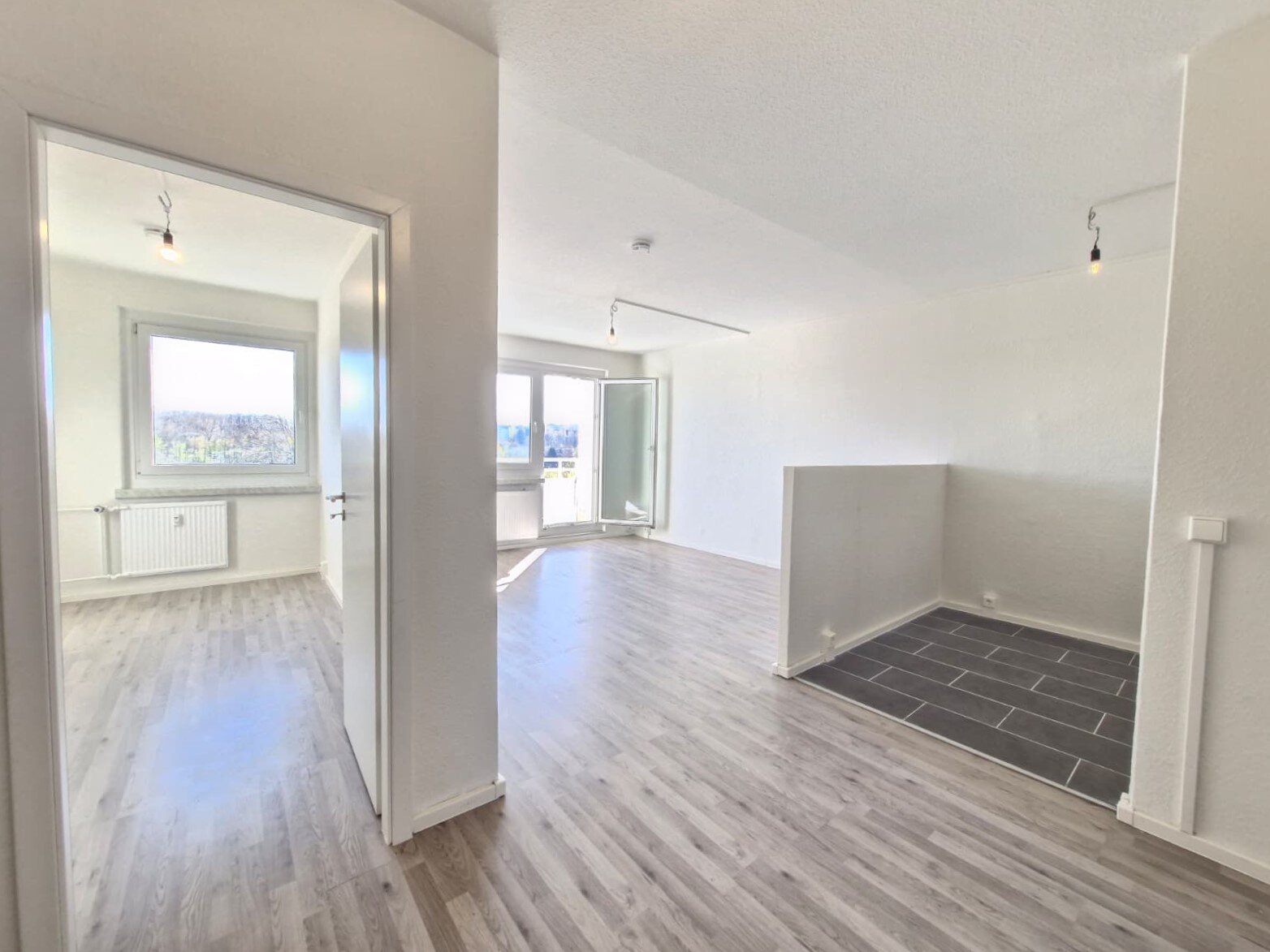 - Laminat- Bodenbelag und Raufasertapete in den Wohnräumen