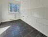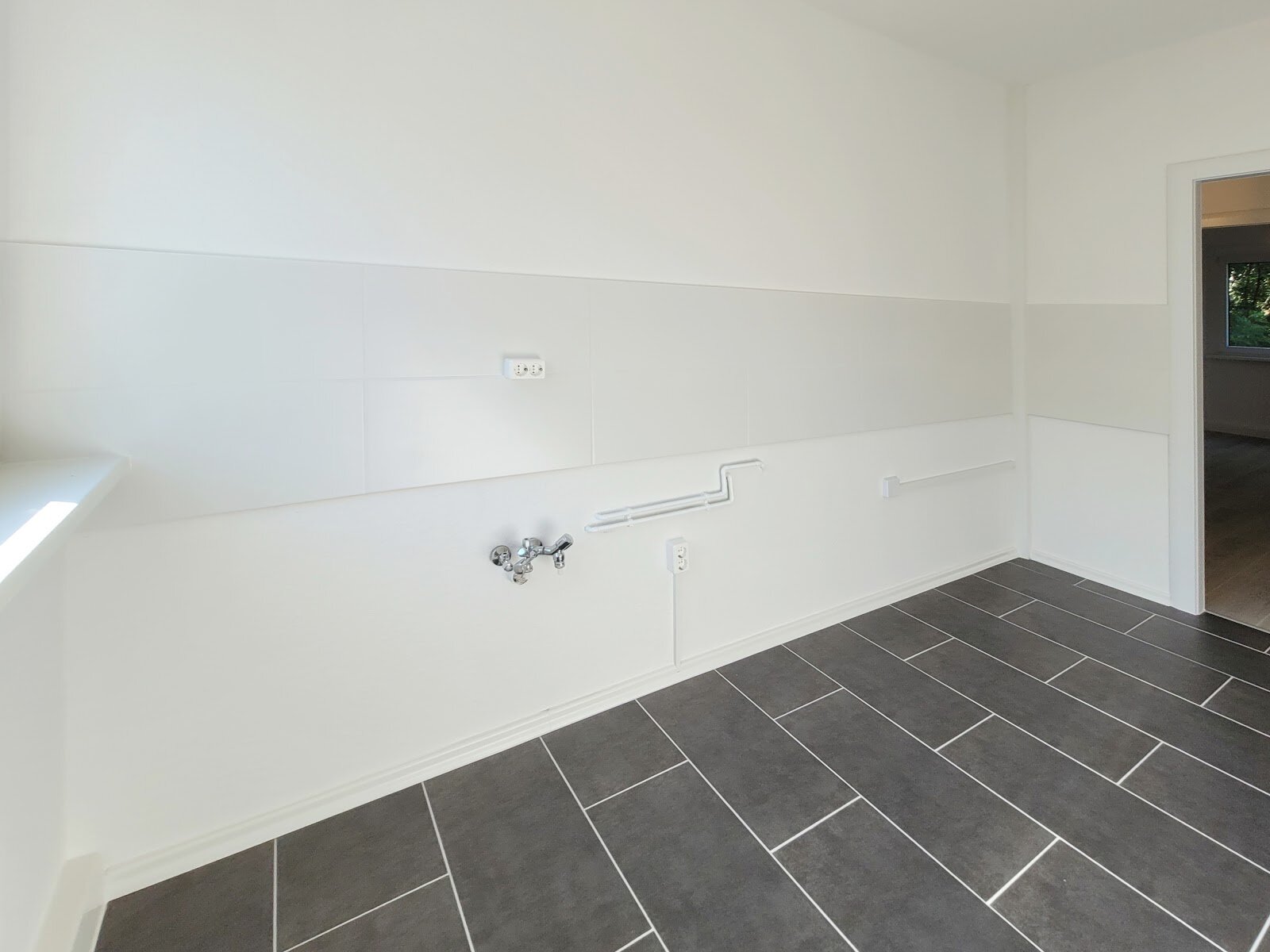 - Anthrazite Boden- und weiße Wandfliesen in der Küche