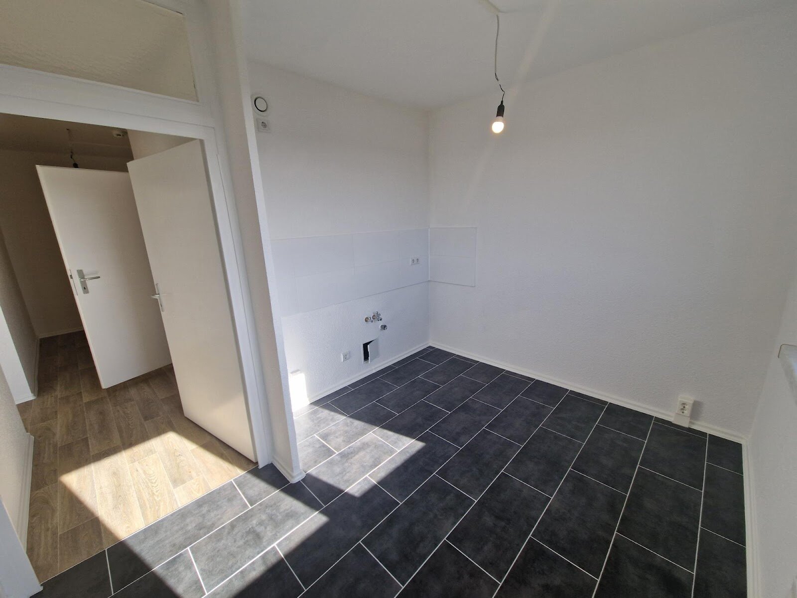 - Anthrazite Boden- und weiße Wandfliesen in der Küche
