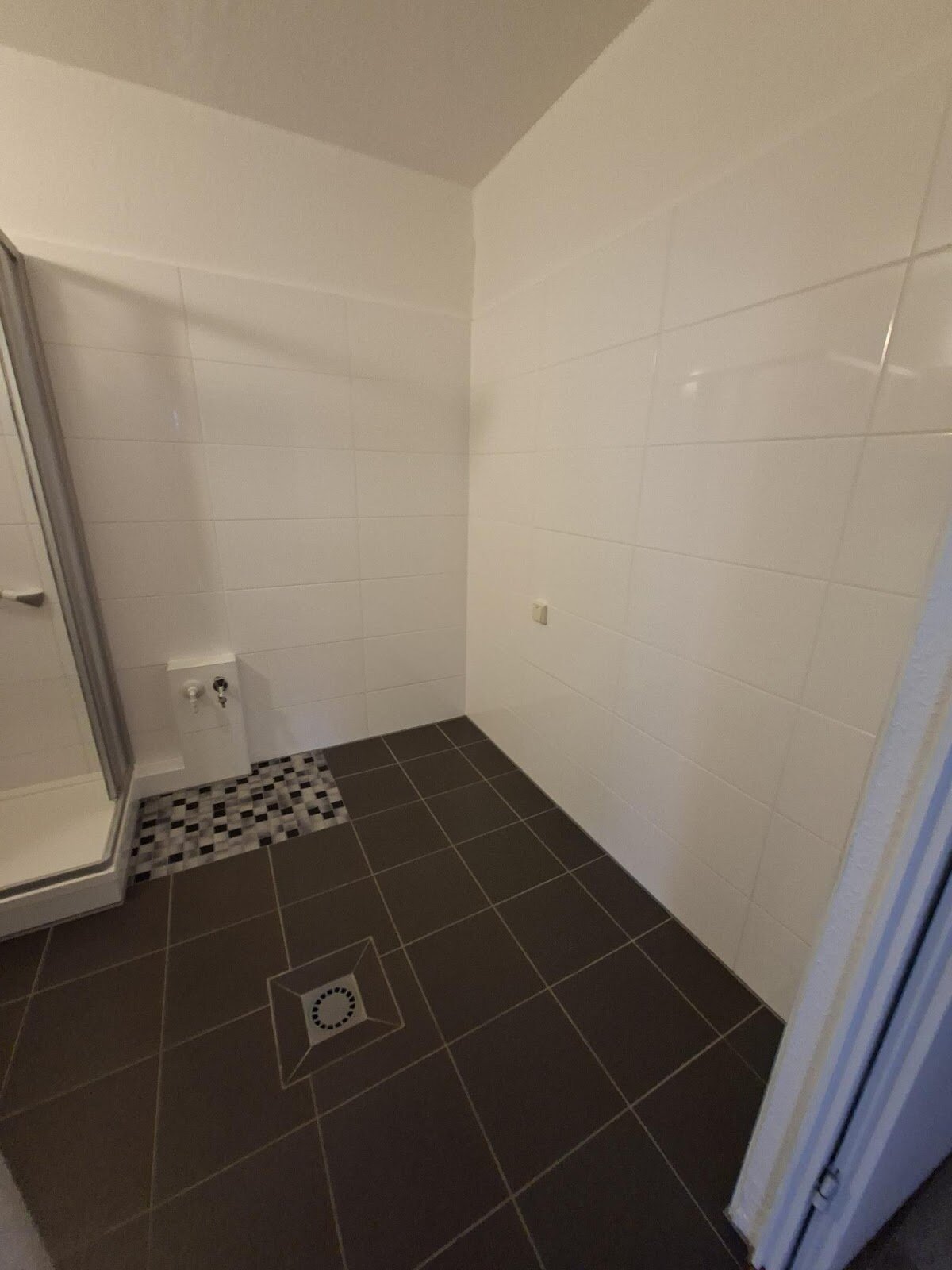- Anthrazite Boden- und weiße Wandfliesen im Bad