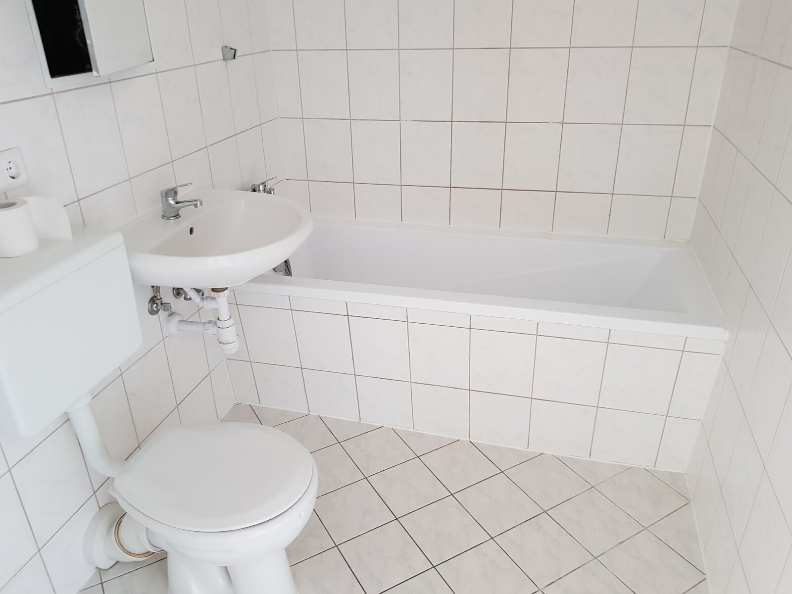 - Helle Boden- und weiße Wandfliesen im Bad