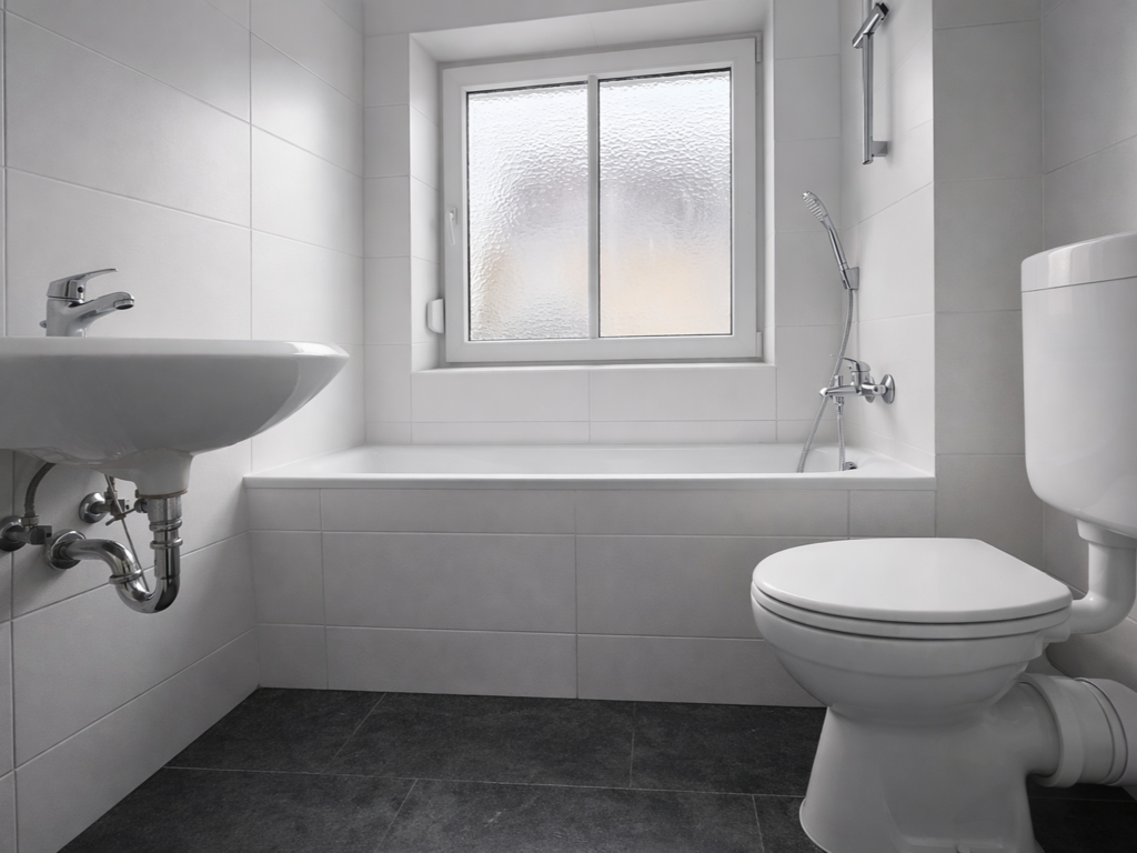 - Anthrazite Boden- und weiße Wandfliesen im Bad