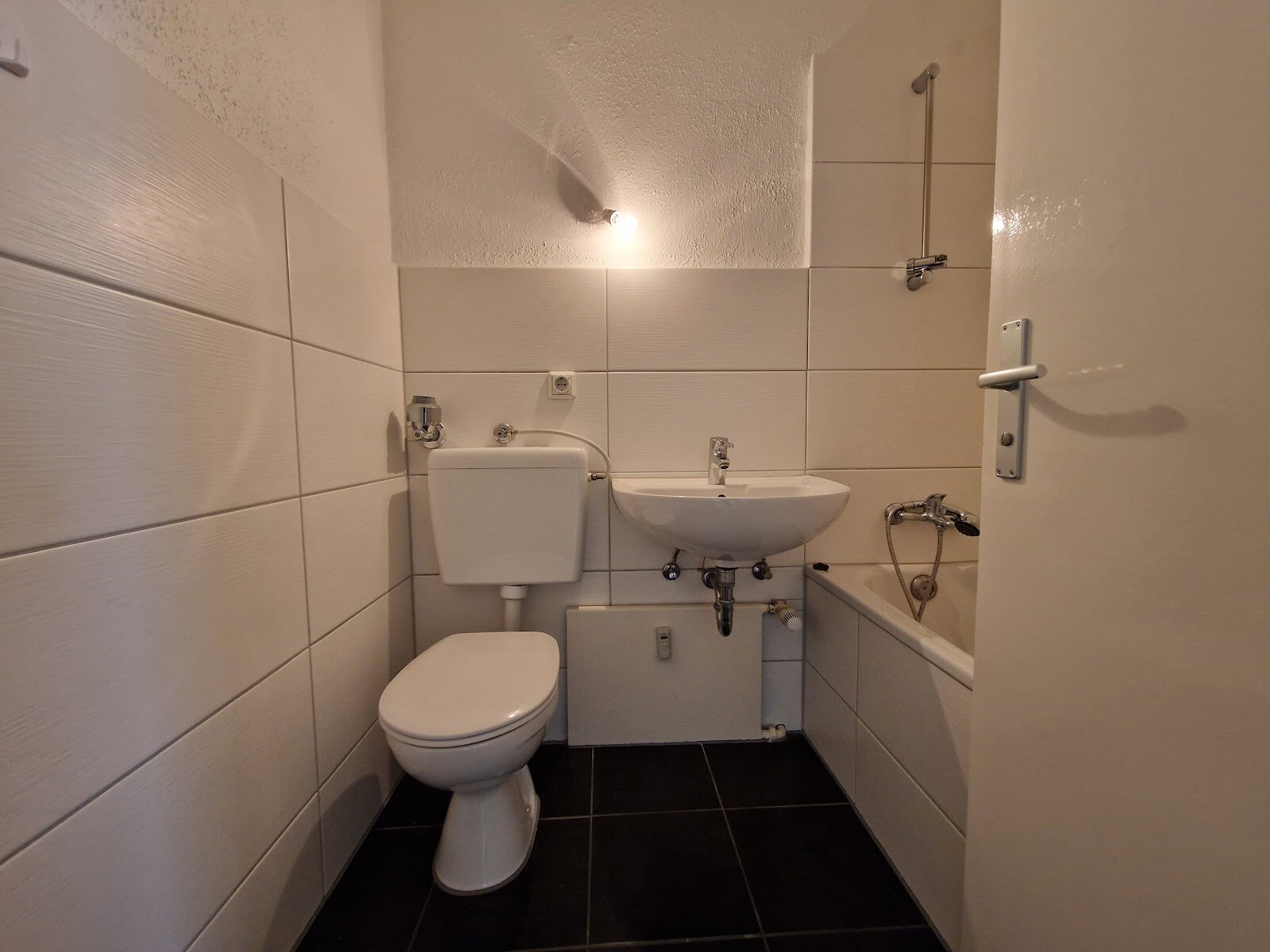 - Anthrazite Boden- und weiße Wandfliesen im Bad