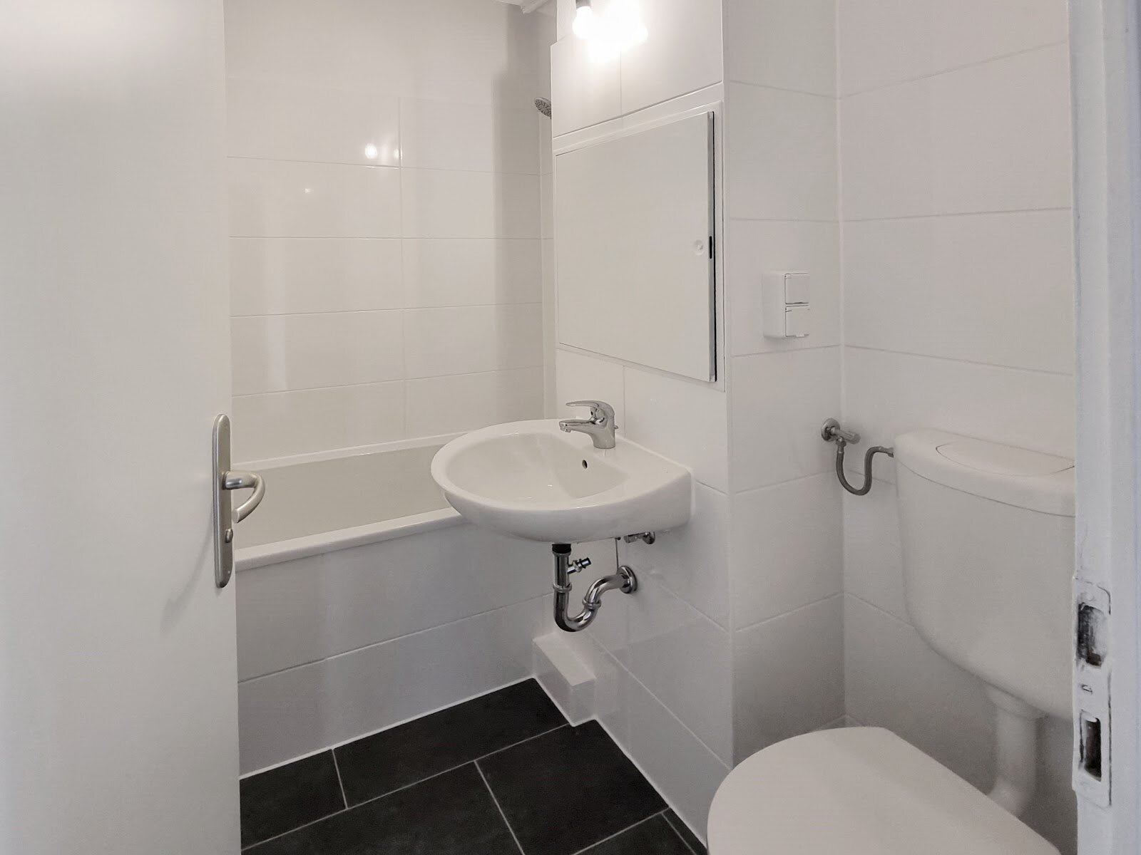 - Anthrazite Boden- und weiße Wandfliesen im Bad