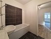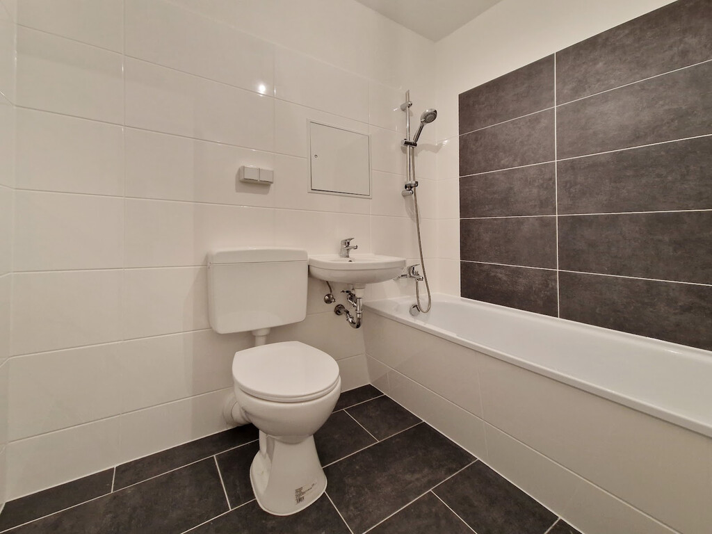 - Anthrazite Boden- und weiße Wandfliesen im Bad