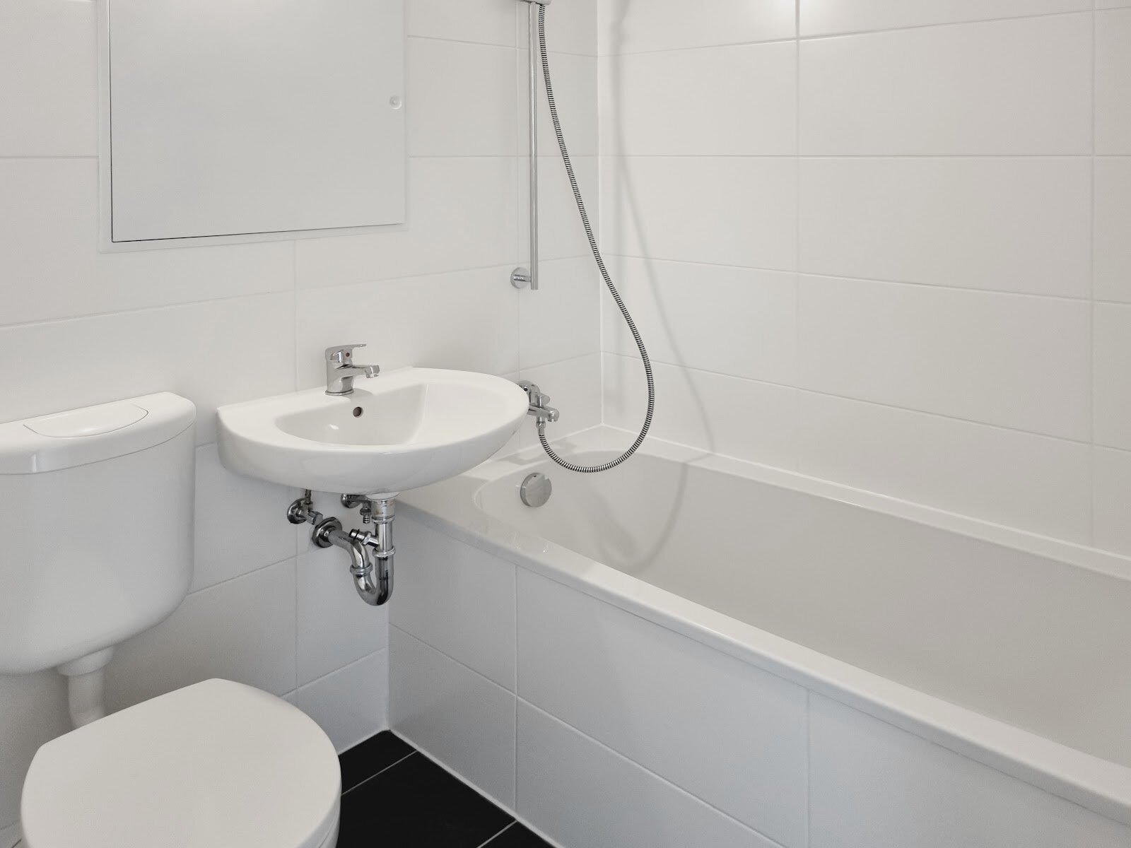 - Anthrazite Boden- und weiße Wandfliesen im Bad
