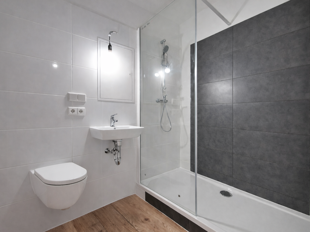 - CV- Bodenbelag und weiße Wandfliesen im Bad
