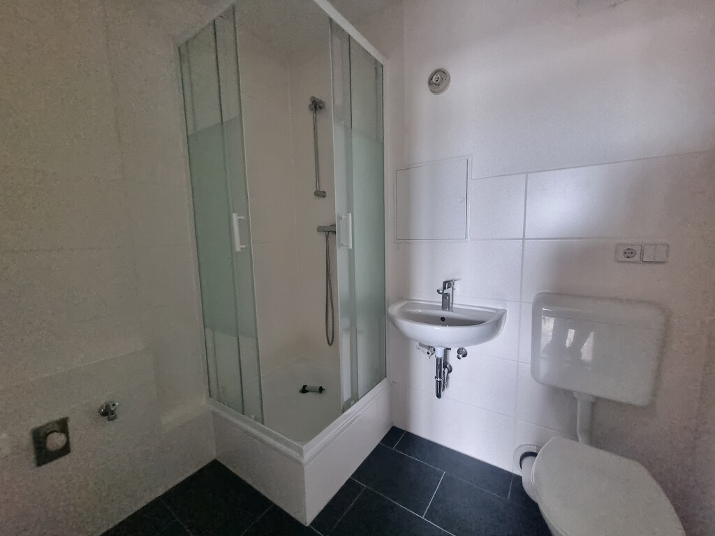 - Anthrazite Boden- und weiße Wandfliesen im Bad