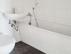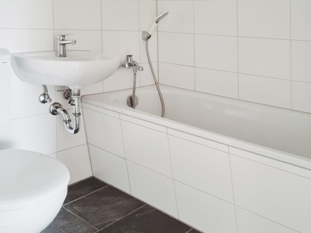 - Anthrazite Boden- und weiße Wandfliesen im Bad
