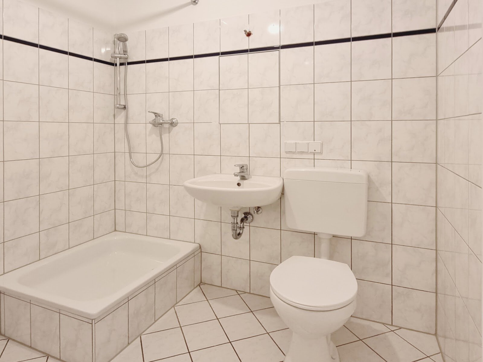 - Helle Boden- und helle Wandfliesen im Bad