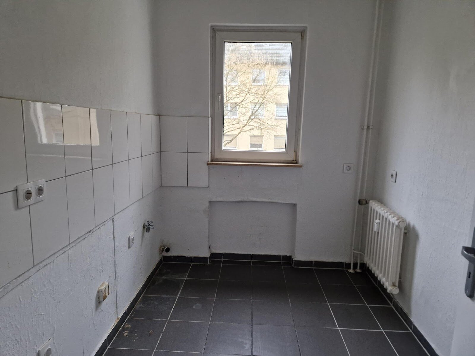 - Anthrazite Boden- und weiße Wandfliesen in der Küche