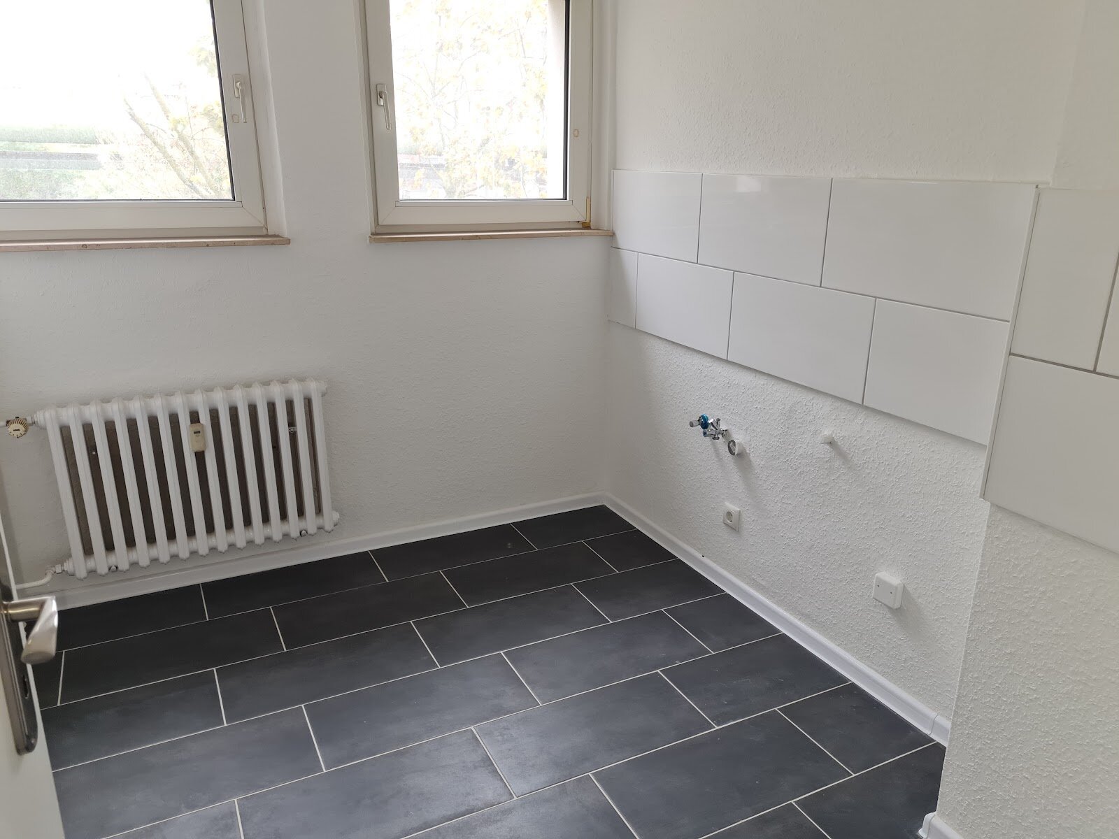 - Anthrazite Boden- und weiße Wandfliesen in der Küche