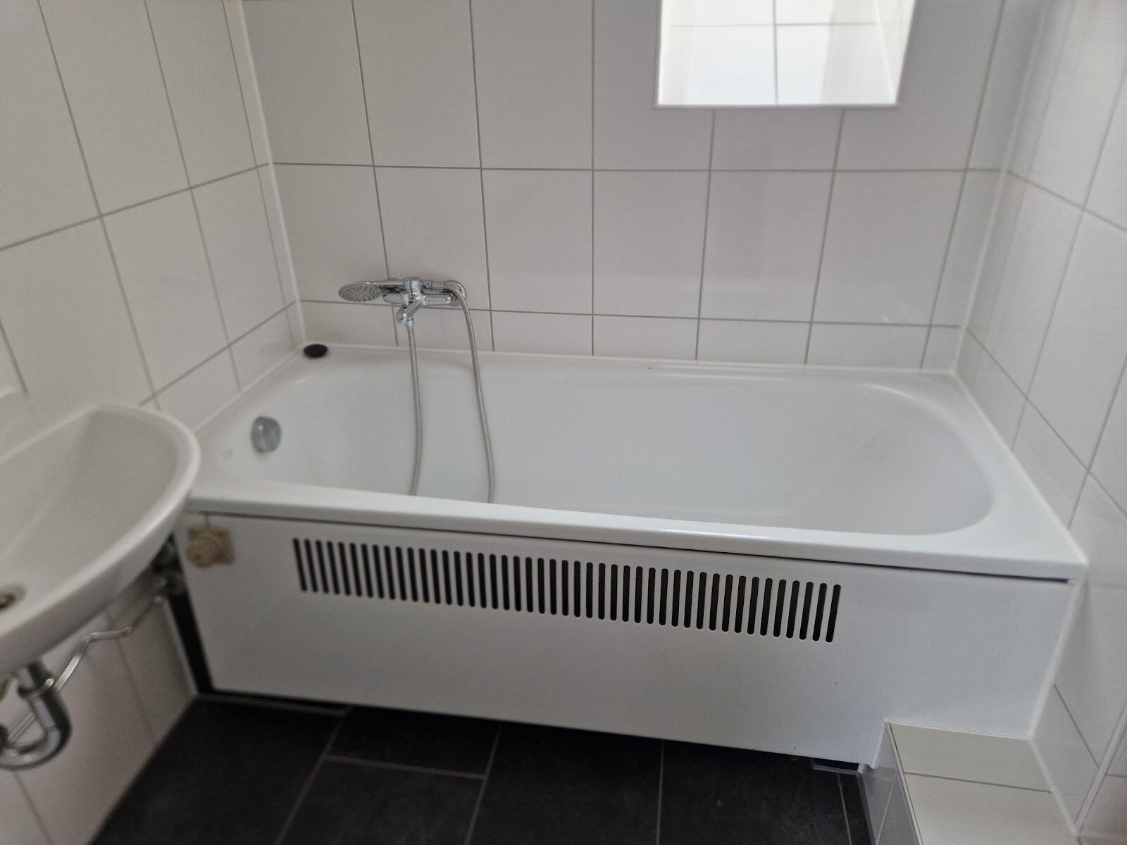 - Anthrazite Boden- und weiße Wandfliesen im Bad