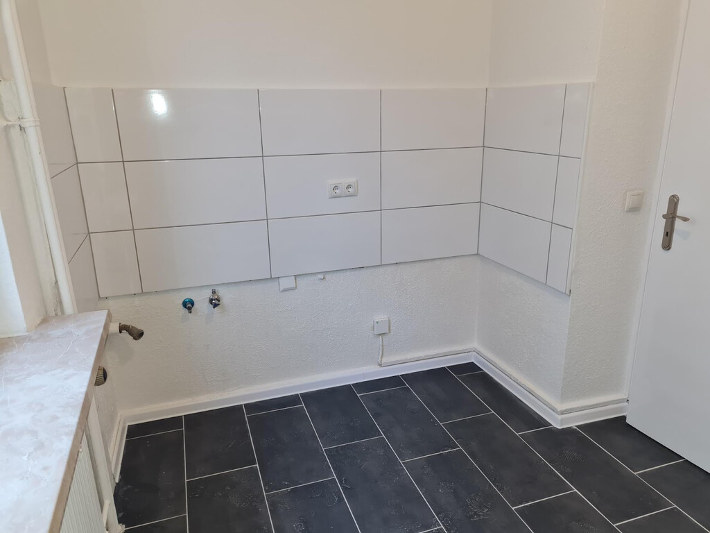 - Anthrazite Boden- und weiße Wandfliesen in der Küche