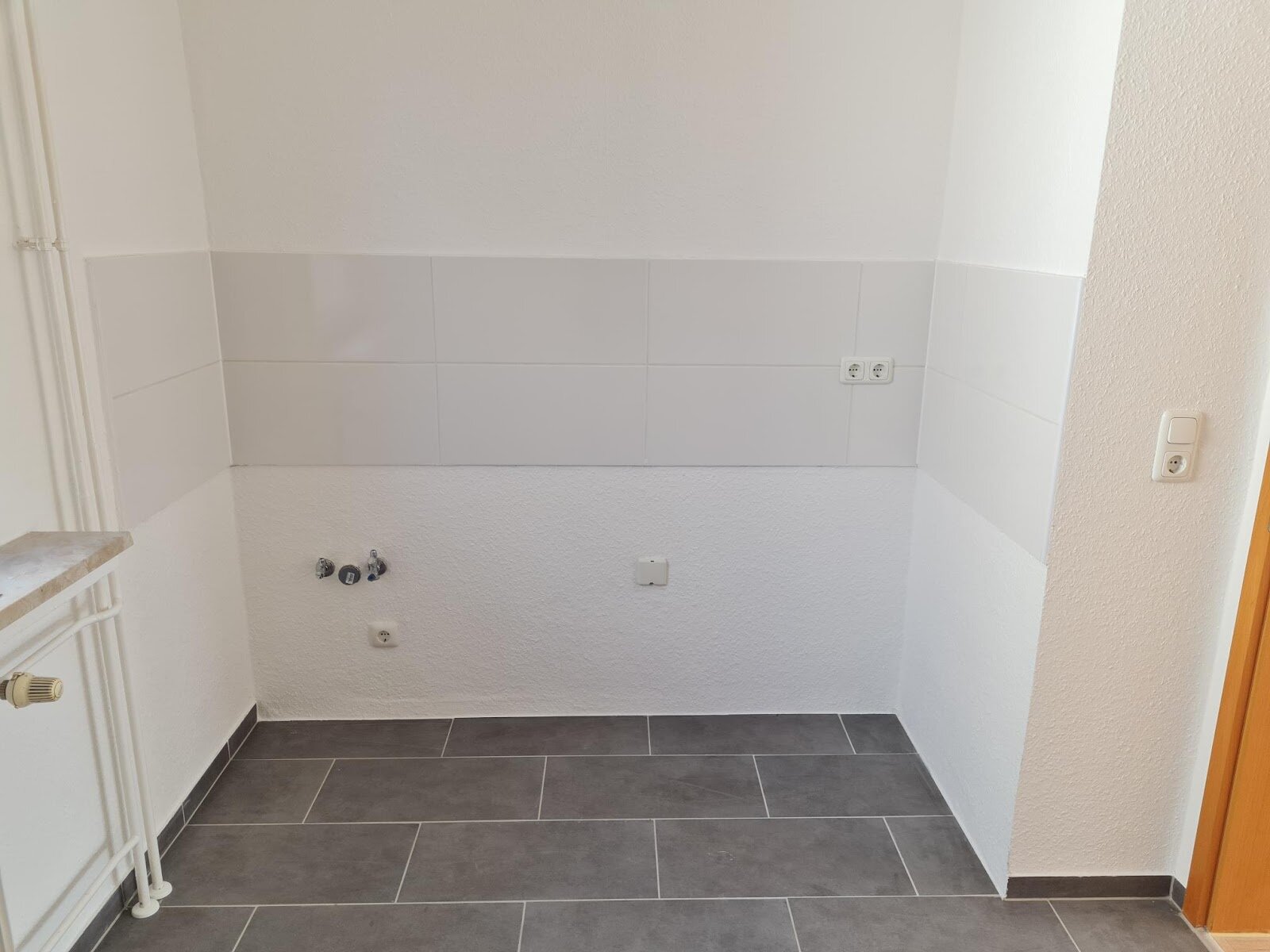 - Anthrazite Boden- und weiße Wandfliesen in der Küche
