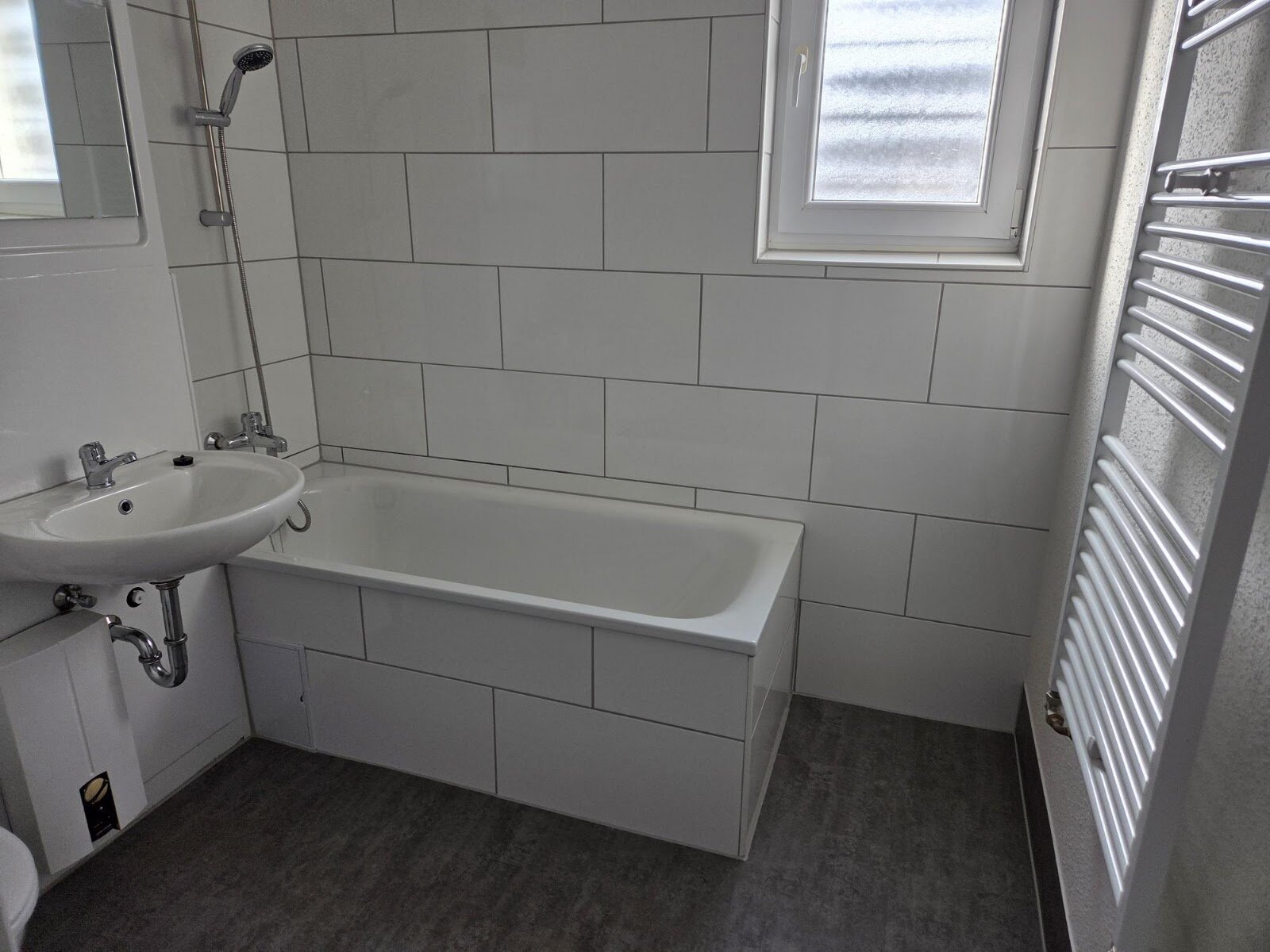 - Anthrazite Boden- und weiße Wandfliesen im Bad